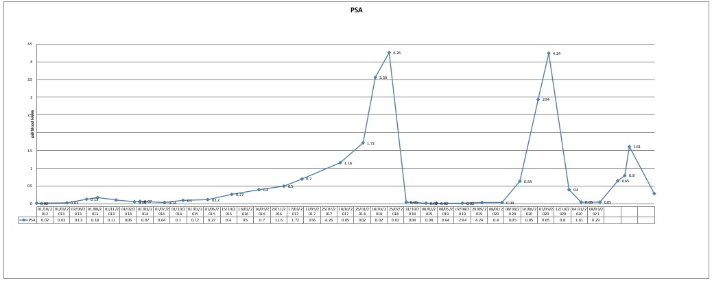 What followed next was a complete surprise first PSA test OCTOBER 2012 came back at 0.02 excellent result, FEBRUARY 2013 PSA came back slightly higher 0.03 ( I always use the same lab for consistency ) mm I thought Professor Neal was not concerned, (I was of course as expected a level playing field of 0.01)